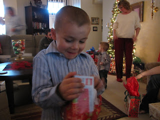 This Christmas Eve we all got a surprise. It started snowing. We were headed to The Colony for Christmas with Grandpa and Grammy when it started. Cole was so excited! It snowed all day. We had a good Christmas there. Patty's sandwiches were good. Cole got a blanket with snowmen on it, which he loves, from Aunt Bunny. He now knows her as the crazy lady. Not sure why.... Got there and back safely. We made it to Moms only sliding once. Made it to Mike and Sue's and home. Kendall and Tasha never made it home from Mom's. Cole got to decide this year what snack Santa was going to have when he got to our house. He chose suger cookies, a fruity pebble treat and a kit kat. Santa ate it all but one cookie. It was a great Christmas Eve. The snow made it extra special.